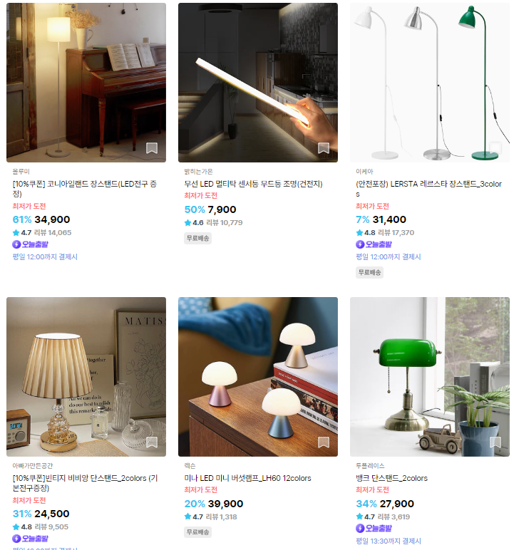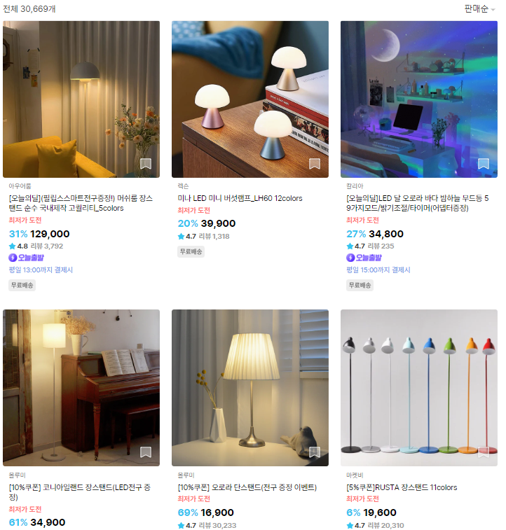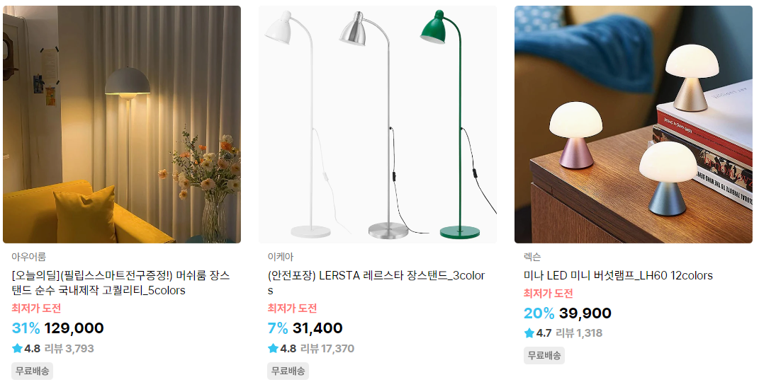 또한 공통적으로 가격이 비싸지 않은 조명들이었습니다. 첫번째 랭크된 머쉬룸 장스탠드가 유일하게 10만원이 넘는 가격대를 보이고 있을 뿐 나머지는 4만원 이하의 상품들이었습니다.